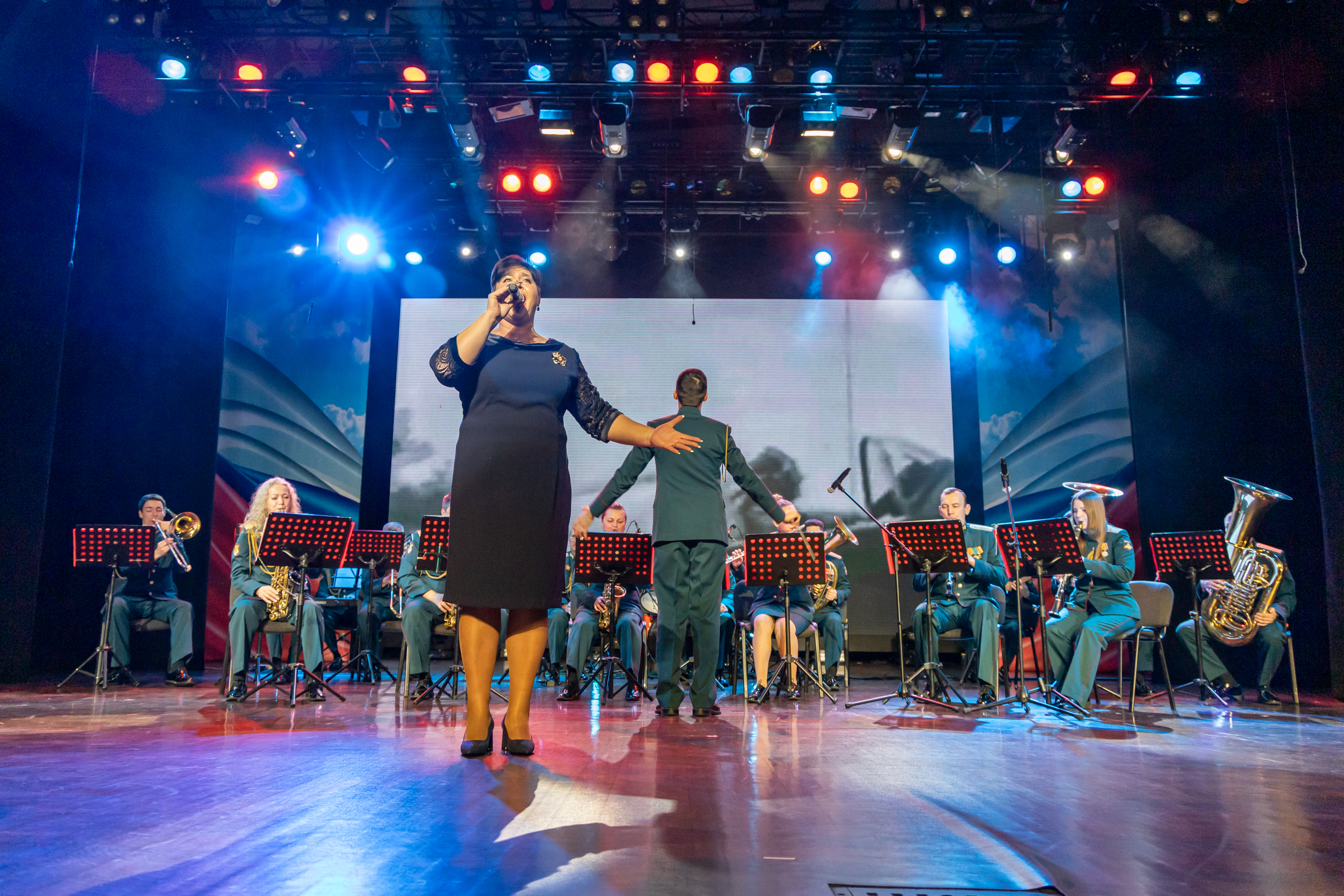 Оркестр 14-й отдельной гвардейской ордена Суворова и Кутузова бригады специального назначения исполнил торжественные марши и душевные инструментальные номера, которые задали тон всему вечеру. В программу также вошли яркие номера творческих коллективов Дворца: вокальные соло, хореографические постановки и ансамблевые выступления, каждое из которых звучало с искренностью и уважением.