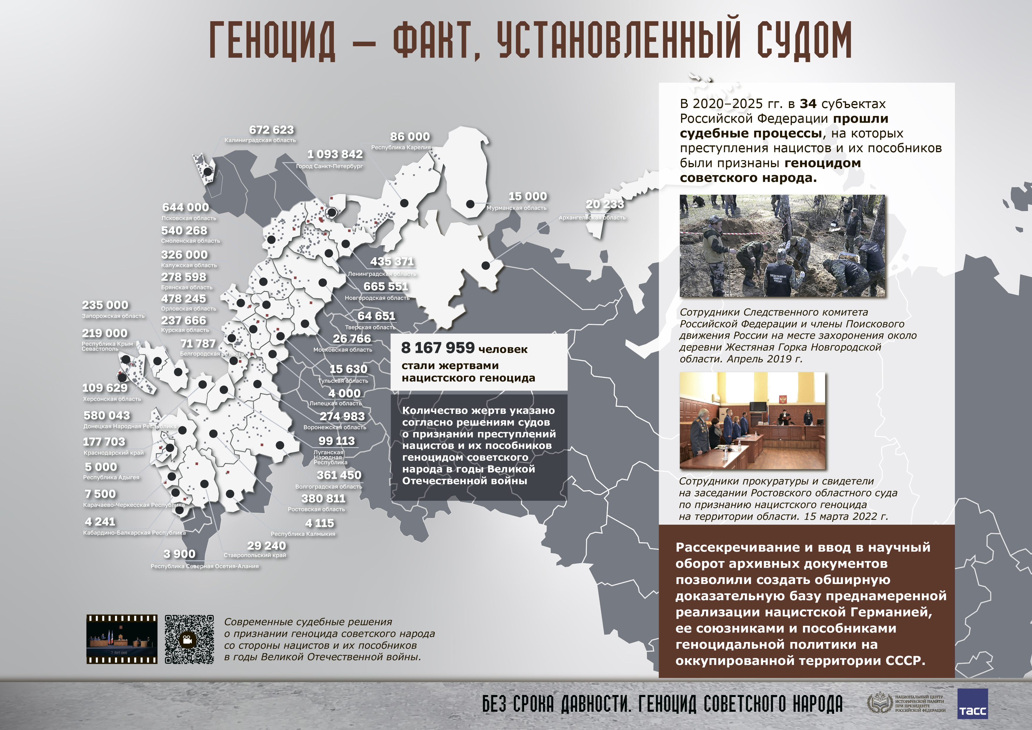 Более 8 167 959 человек признано жертвами геноцида советского народа со стороны нацистов и их пособников на оккупированной территории Советского Союза в границах современной Российской Федерации.