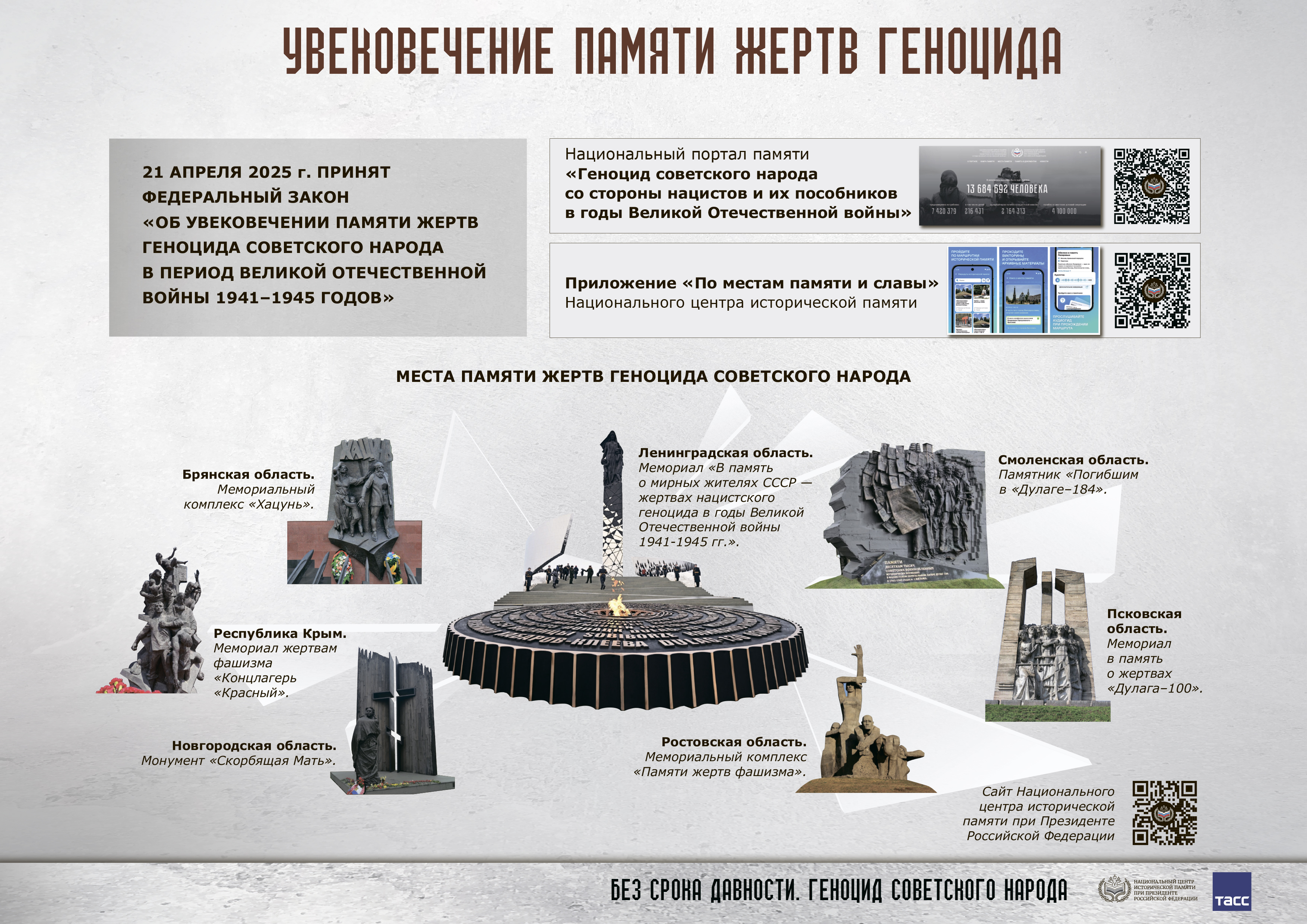 В память о геноциде советского народа нацистами и их пособниками в годы Великой Отечественной войны ежегодно 19 апреля в рамках проекта «Без срока давности» по всей стране традиционно проходит День единых действий, целью которого является сохранение исторической правды о преступлениях нацистов и их пособников в отношении мирных советских граждан и военнопленных красноармейцев в годы Великой Отечественной войны на оккупированной территории и формирование неприятия нацизма в любых его проявлениях – как в исторической ретроспективе, так и в современности.