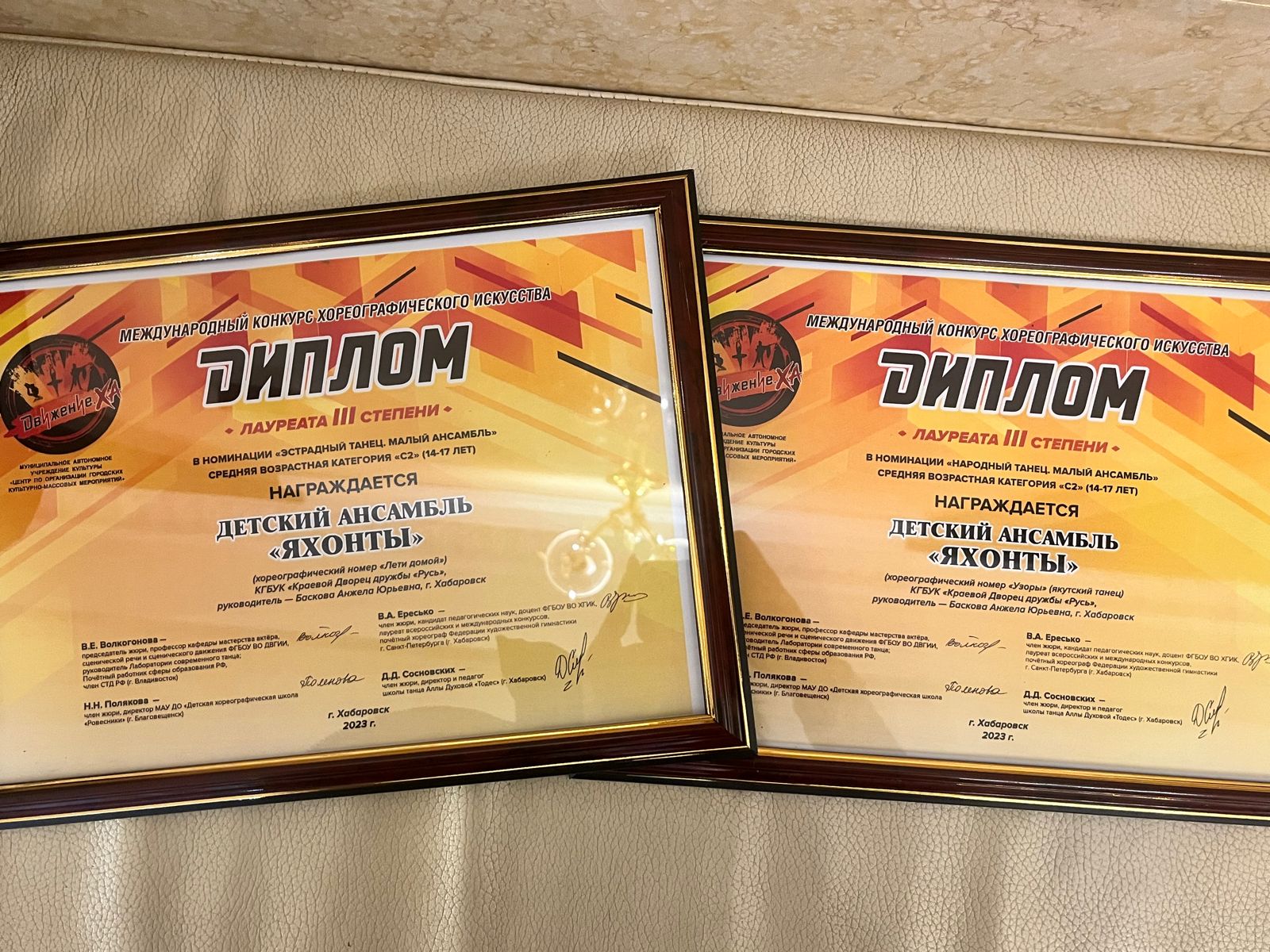 Ансамбль танца "Яхонты" с хореографическими номерами "Лети домой" и "Узоры" (якутский танец) стали лауреатами III степени в Международном конкурсе хореографического искусства "Движение.Ха". Руководитель ансамбля - Баскова Анжела Юрьевна.