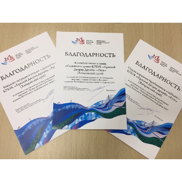 Благодарность за активное участие в подготовке и проведении выставки " Улица Дальнего Востока" в рамках Восточного экономического форума 2017