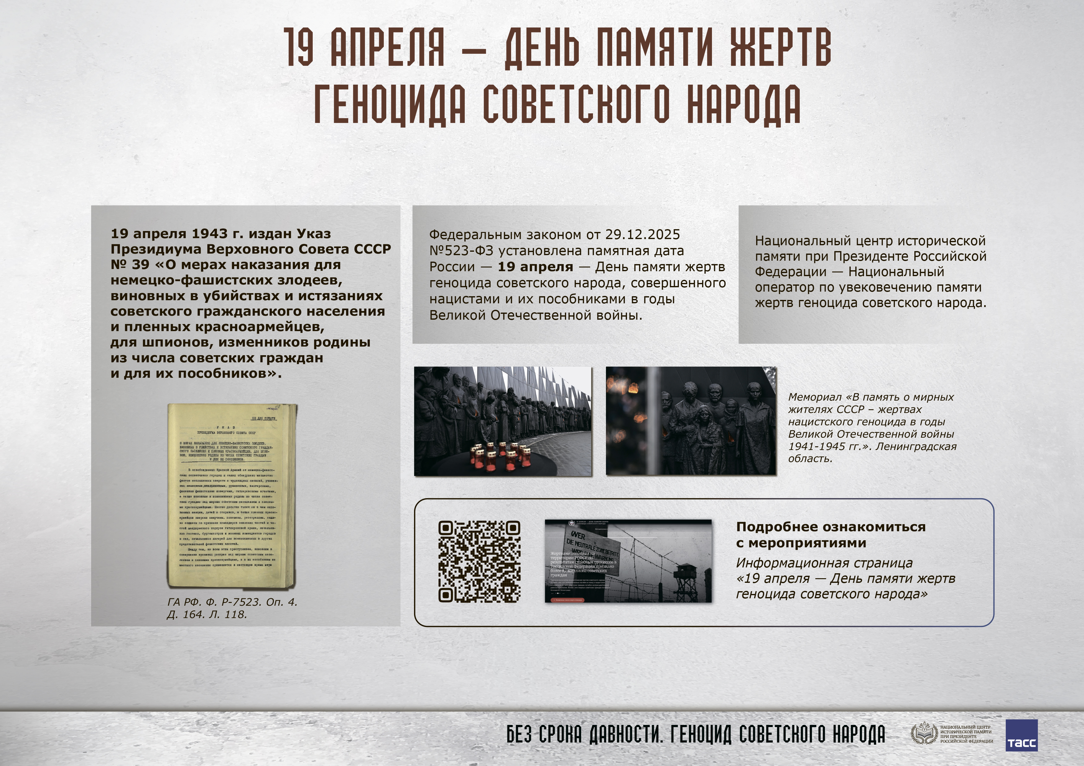 В память о геноциде советского народа нацистами и их пособниками в годы Великой Отечественной войны ежегодно 19 апреля в рамках проекта «Без срока давности» по всей стране традиционно проходит День единых действий, целью которого является сохранение исторической правды о преступлениях нацистов и их пособников в отношении мирных советских граждан и военнопленных красноармейцев в годы Великой Отечественной войны на оккупированной территории и формирование неприятия нацизма в любых его проявлениях – как в исторической ретроспективе, так и в современности.